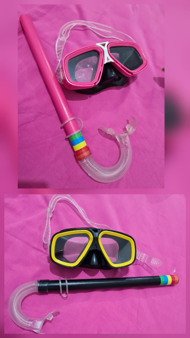 Pembe ve sarı renkli, fiyonk detaylı ve uyumlu tasarıma sahip dalış gözlüğü, gökkuşağı desenli snorkel ile birlikte plaj için uygun. ️