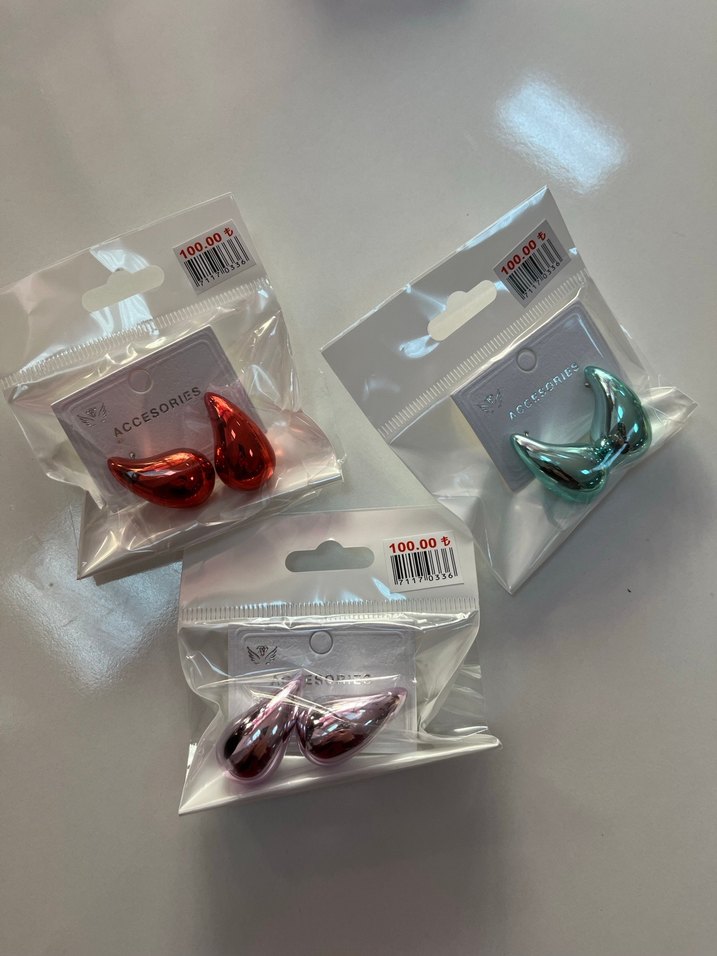 Kırmızı, mavi ve pembe tonlarında renkli damla şekilli tırnak süsleri, tek tek paketlenmiş.