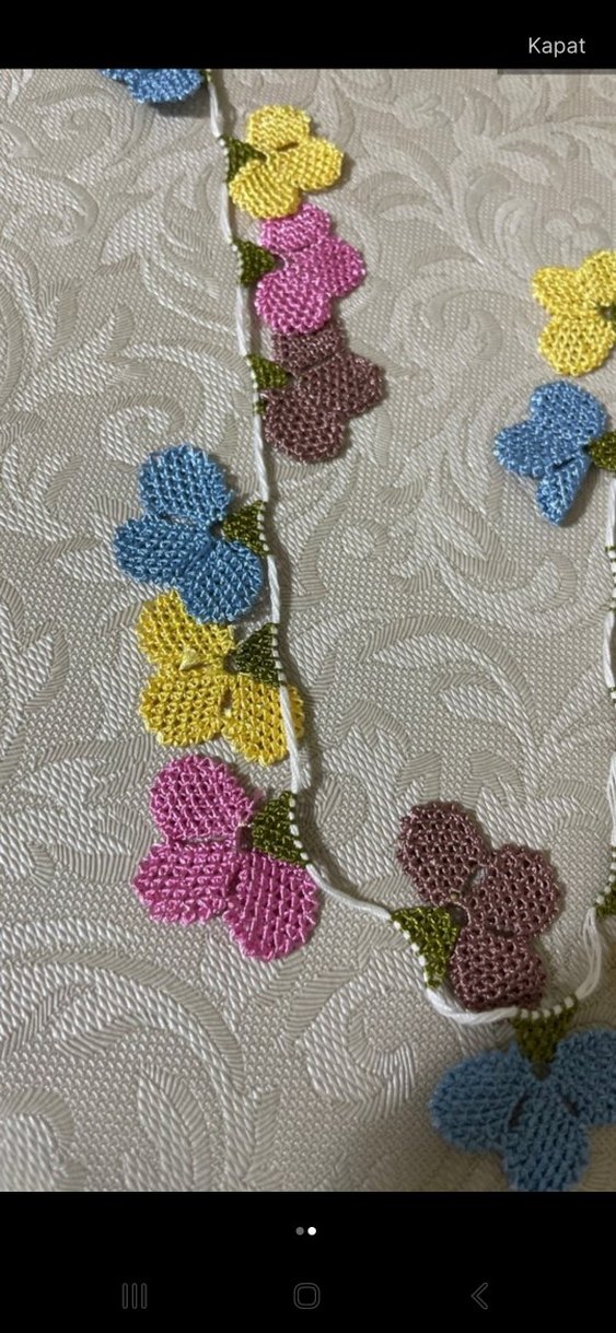 Kadınlar için pastel tonlarda renkli örgü çiçekler ve dantel detayları içeren bohem tarzda bir atkı. Canlı renkler ve retro hippie havası taşır.