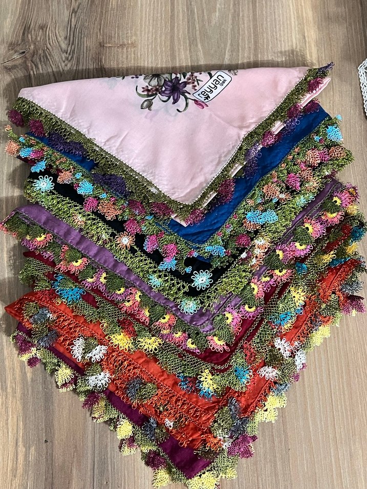 Tane ile Satılmaktadır. Renkli dantel kenar detaylı, tekstil malzemeden yapılmış bohem tarzda kadın fuları. Retro ve hippie stiller için uygun.
