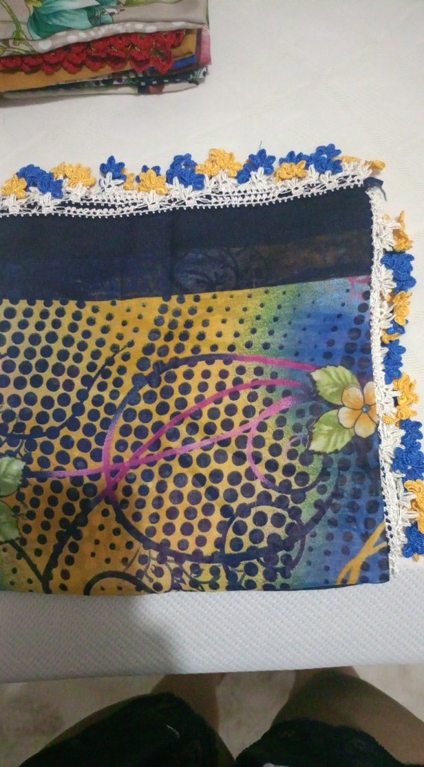 Çiçek ve puantiye desenli, renkli ve dantel detaylı bohem tarzda kadın eşarbıdır