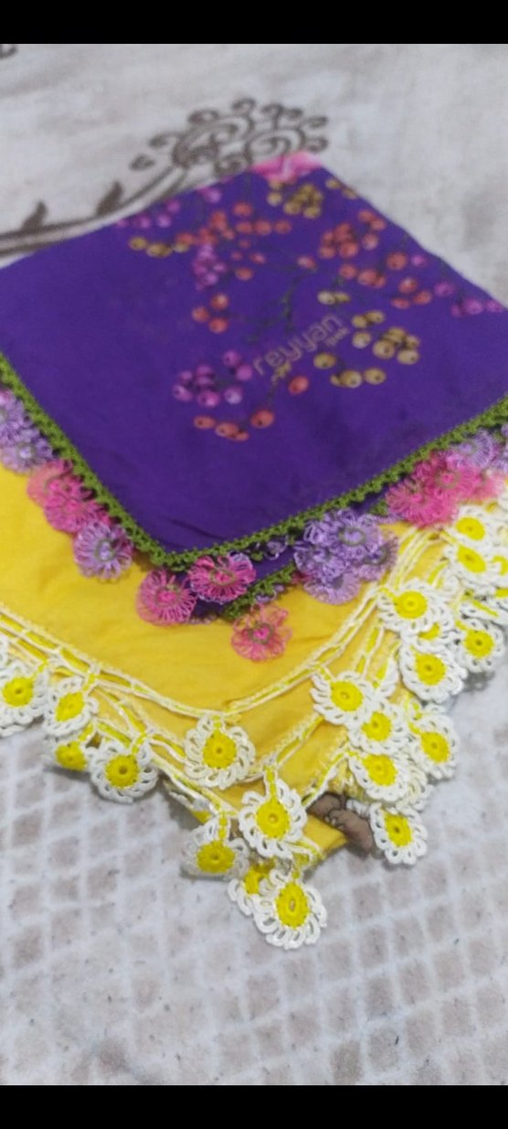 Renkli, dantel uçlu kadın fuları. Yumuşak dokulu tekstil malzemeden, bohem ve retro tarzları için uygun.