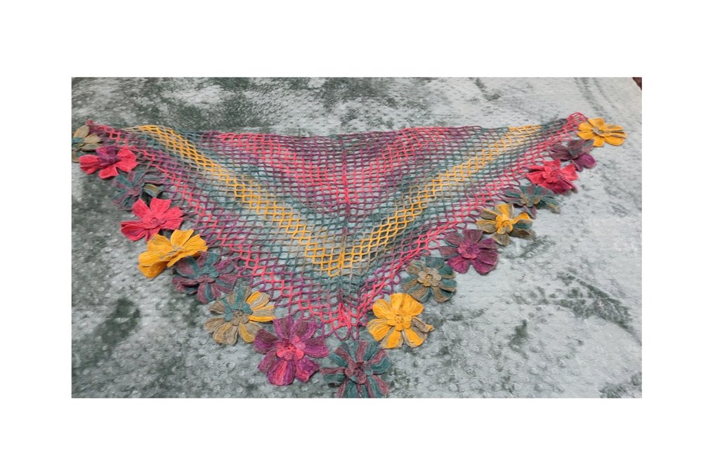 Canlı renklerde örülmüş, kenarları dantel çiçek detaylı bohem tarzda kadın şalı.