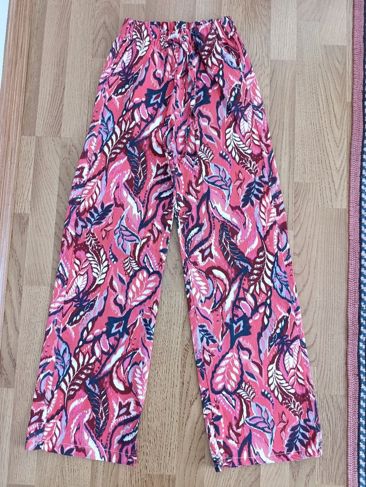 Renkli tie-dye desenli, dantel detaylı, bol kesim uzun kadın pantolon. Yumuşak sentetik kumaştan, bohem tarzda, açık hava kullanımı için uygun.