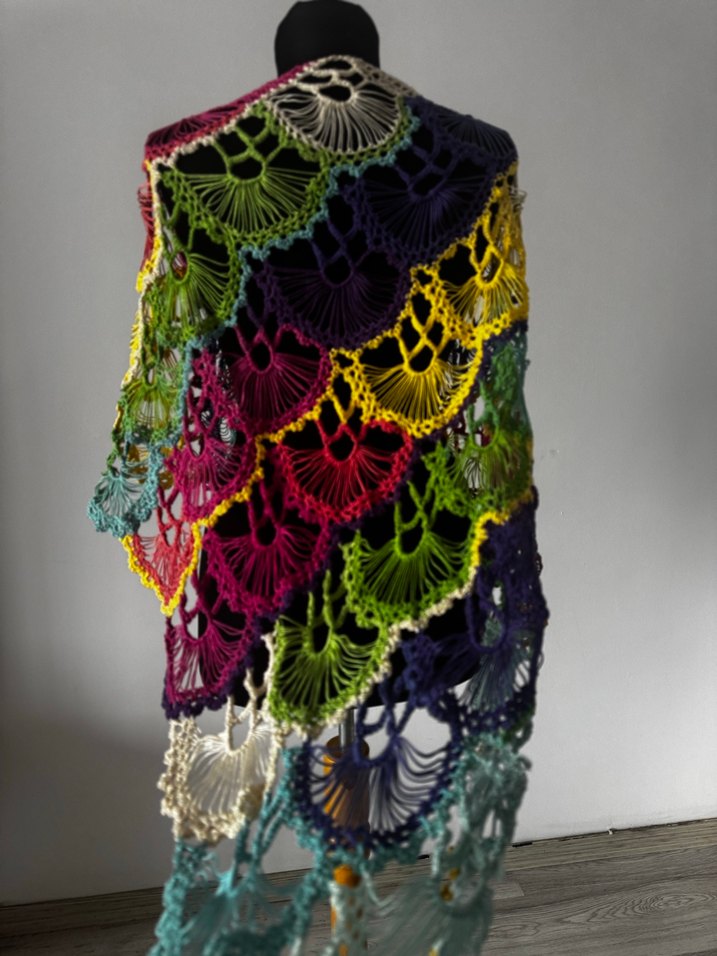 Renkli, dantel detaylı kadın örgü şal. Canlı renkleri ve bohem tarzıyla retro, hippie havası taşıyor. Standart bedendir Tüylenme yapmaz 30° soğuk makine yıkaması uygundur