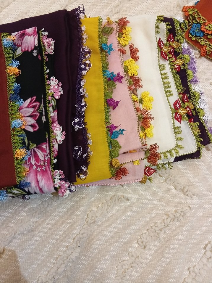 Renkli tekstilden yapılmış, dantel detaylı kadın fuları. Bohem ve retro tarzda, canlı ve hippie görünüme uygun. iğne oyaları