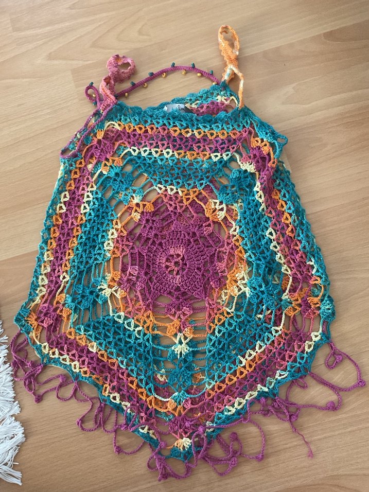 Renkli örgü kız çocuk pareo, dantel detaylı, askılı ve halter yaka ile bohem tarzda, salaş kesim.özel dikimdir yaş olarak 10-11 için boy ve kiloya göre değişiyor