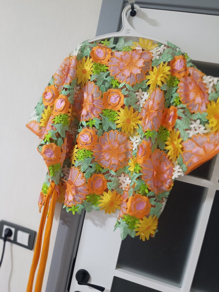 Sentetik kumaştan, renkli çiçek desenli ve dantel detaylı bohem makrome panço pareo