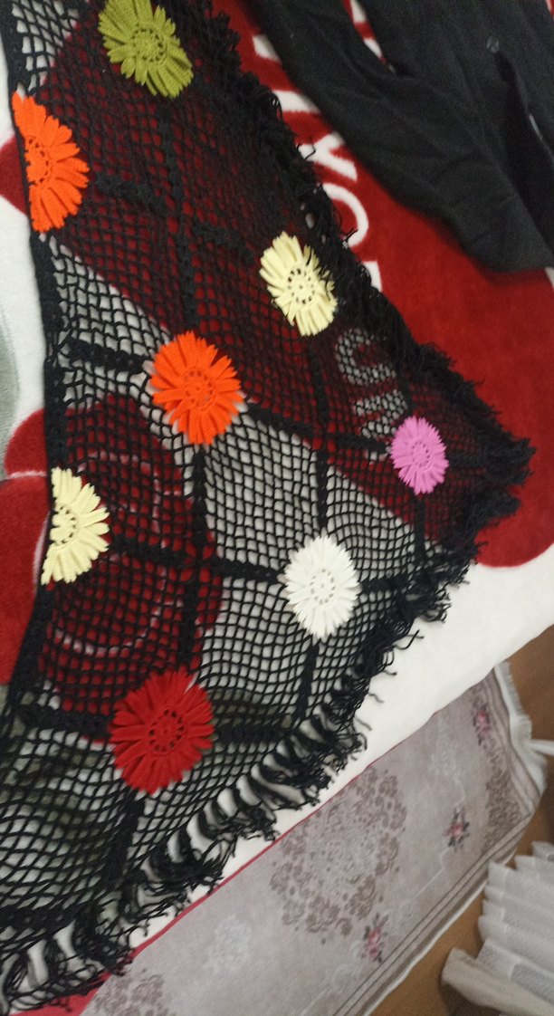 Renkli çiçek desenli örgü kadın şalı, dantel detaylı ve püsküllü kenarlarıyla bohem tarzı yansıtıyor.