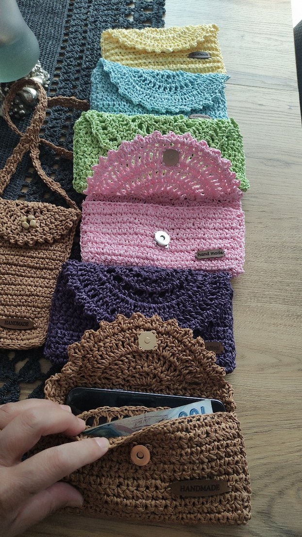 Kadınlar için örgü dokulu, dantel detaylı, açık renkli çok renkli bohem tarzda portföy çanta. Düğme ile kapanır, günlük kullanıma uygundur.