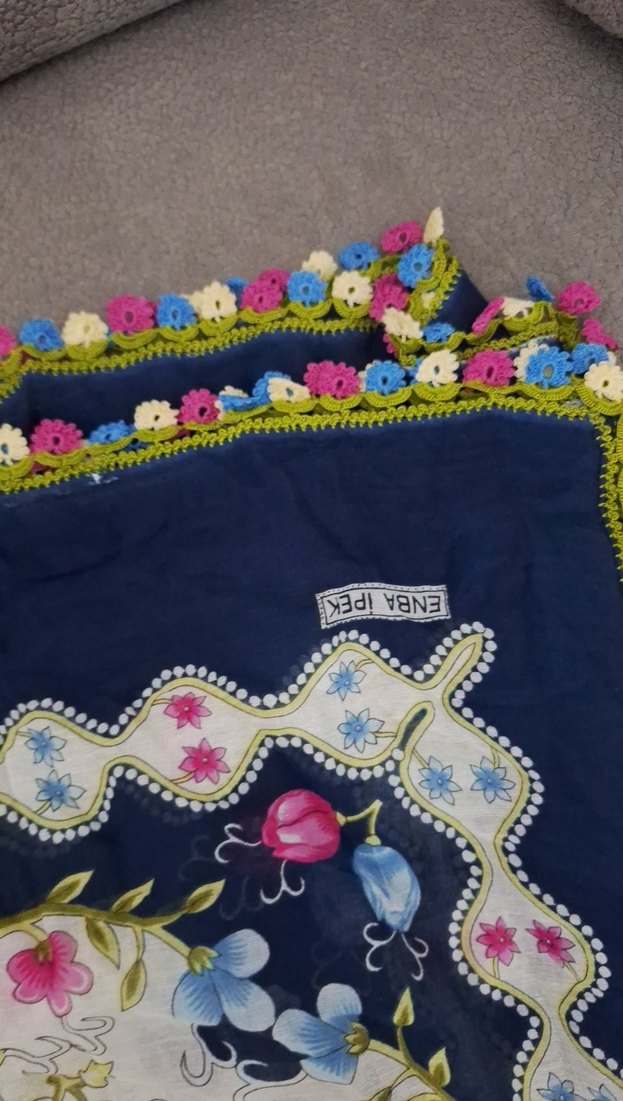 Çiçek desenli, renkli tekstil kadın fular, dantelli kenarları ve bohem tarzıyla dikkat çekiyor. Retro ve hippie stil için uygun.