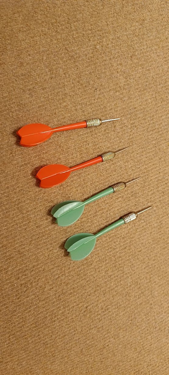 Bu set, turuncu ve yeşil plastik kanatlı, keskin metal uçlu dört renkli darts okundan oluşur.