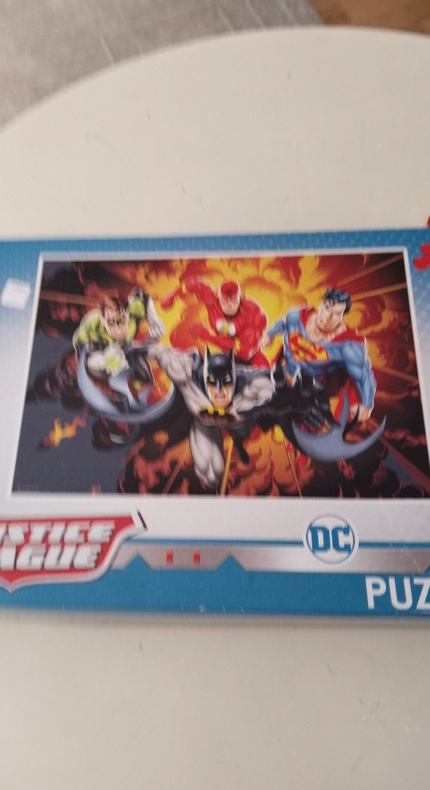 Renkli DC süper kahramanlar figürlü çocuk puzzle'ı. Kutusu gri renkte olup üzerinde 'PUZ' yazısı bulunur.