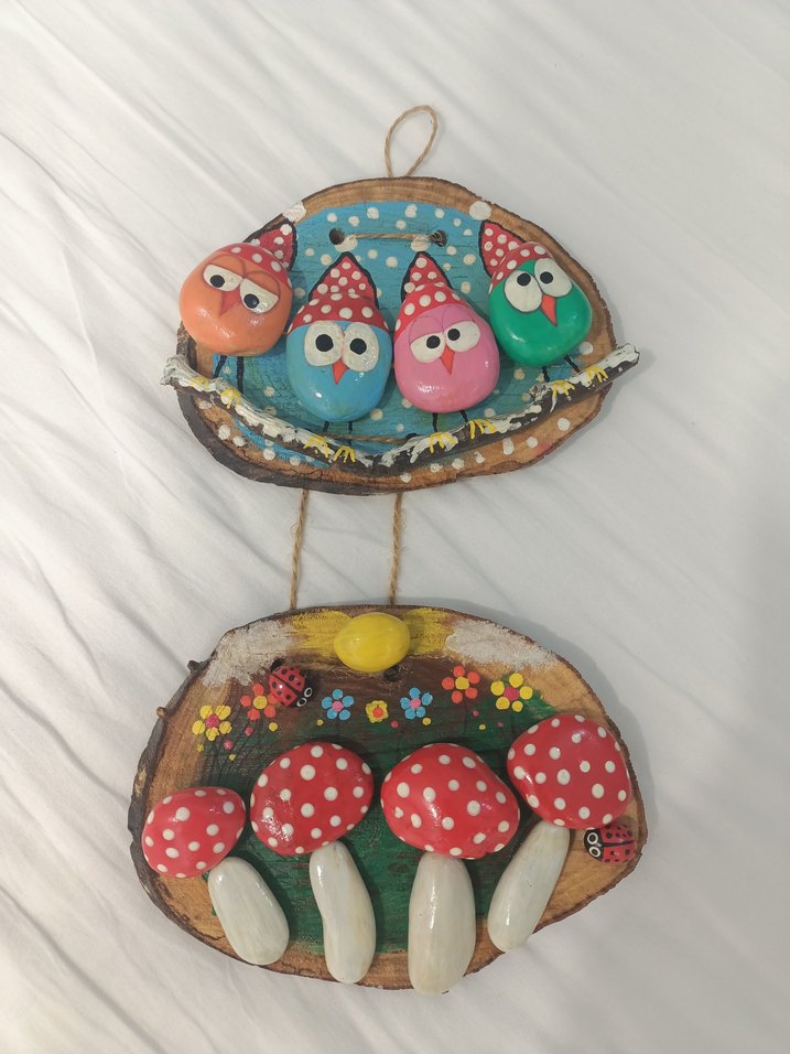 Renkli ahşap duvar süsünde şapkalı sevimli baykuşlar ve beyaz benekli kırmızı mantarlar bulunur, ip ile bağlıdır. Eğlenceli bir atmosfer yaratır.