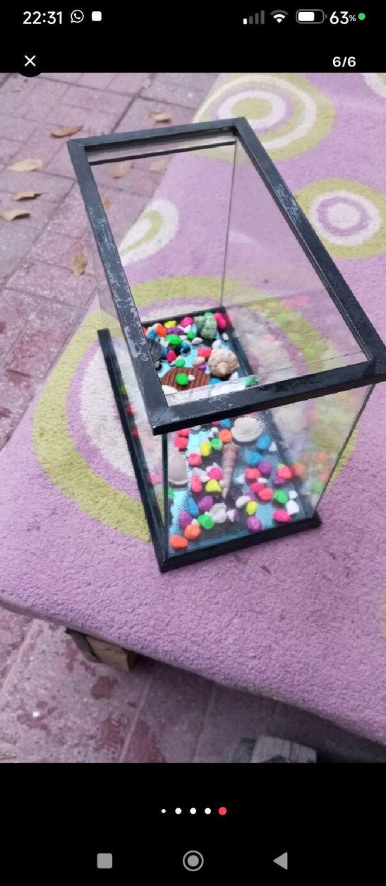 Küçük cam akvaryum, siyah çerçeveler ve renkli çakıl taşlarıyla süslenmiş tabanıyla evcil hayvanlar veya dekorasyon için uygundur.su kaçırması yok gönül rahatlığıyla alabilirsiniz Gebze içi elden teslim edebilirim Gebze dışı kargo alıcıya aittir hayırlı satışlar