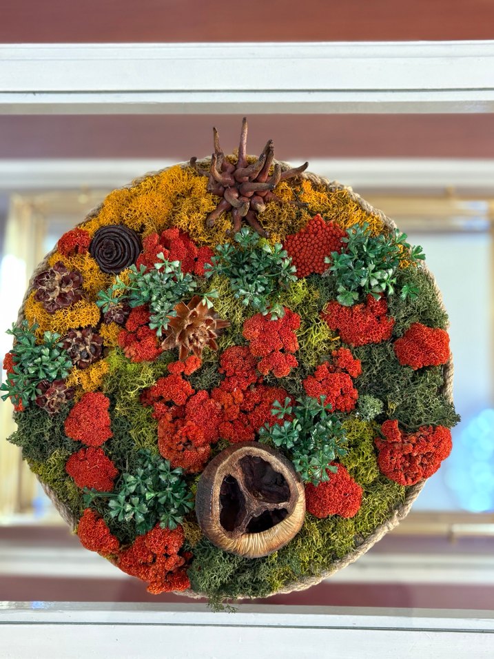 Canlı renklerde çeşitli bitkilerle hazırlanmış dekoratif duvar süsü, ev dekorasyonuna hareket katar. Kendi el emeğimdir.