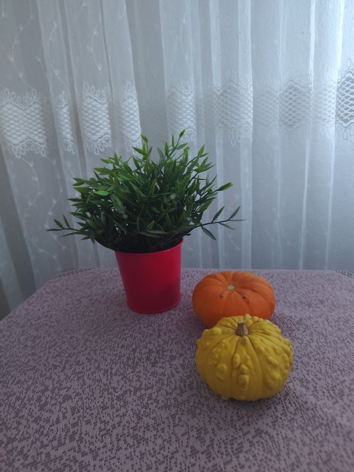 Kabartmalı yüzeye sahip renkli dekoratif kabaklar ve kırmızı saksıda küçük yeşil bitki. Canlı ve renkli ev aksesuarları.