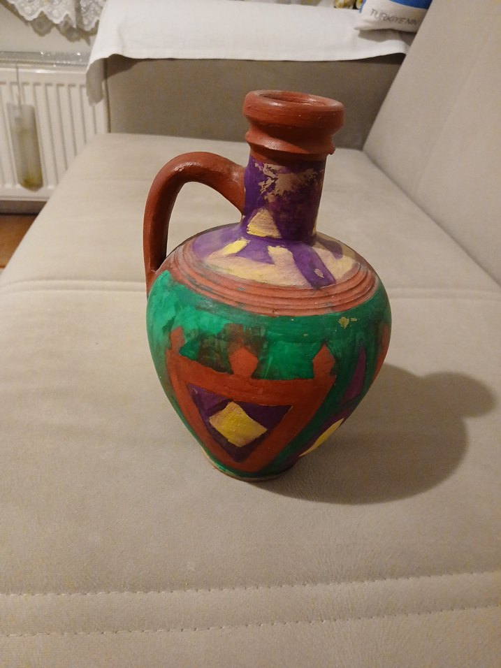 Bu renkli vazo, kulplu tasarımı ve yeşil, mor, sarı geometrik desenleriyle dikkat çeker. Geleneksel şekildedir.El boyamasıdır.