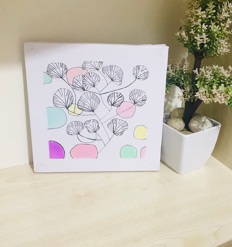 Bu minimalist tablo, siyah ince yaprak çizimleri ile çok renkli yumuşak şekillerin birleşimiyle hafif ve zarif bir görünüm sunar.