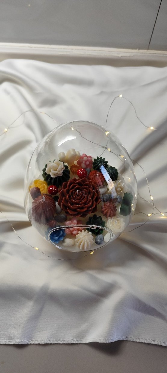 Çiçek ve meyve şeklinde renkli dekoratif mumlar, şeffaf cam fanus içinde sergileniyor.