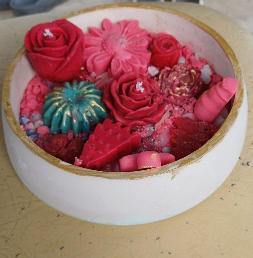 Yuvarlak bir kap içinde çeşitli çiçek şekillerinde, pembe ve canlı renklerde dekoratif mumlar. Soya wax