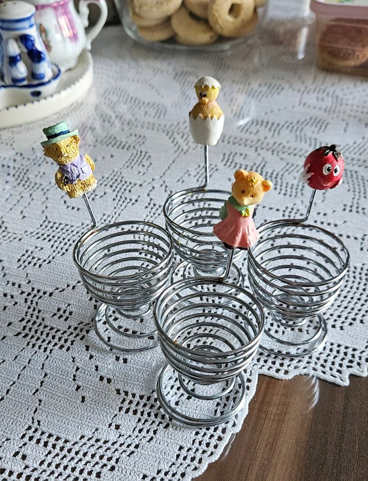 Ayı, civciv ve elma figürlü renkli dekoratif tel yumurtalıklar, masanıza şirinlik katar.4 adet.
