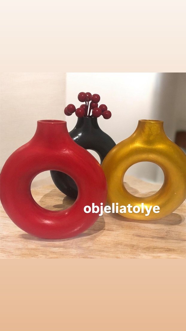 Taş tozu ile üretilmiştir settir istenilen renk yapılır su bazlı verniklidir Canlı kırmızı, siyah ve altın renklerde, dairesel delikli dekoratif vazolar. Modern bir dokunuş için uygundur.