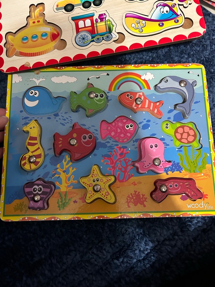 Çeşitli deniz canlılarının gülen yüzleriyle renklendirilmiş ahşap puzzle, çocukların şekil ve hayvanları öğrenmesine yardımcı olur.