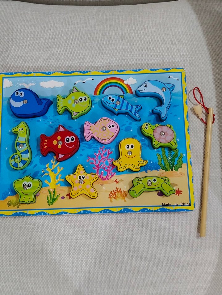 Renkli deniz canlıları ve mıknatıslı oltasıyla eğitici oyuncak, el-göz koordinasyonu ve renk tanımayı destekler. tamamı ahşaptır temiz sorunsuzdur