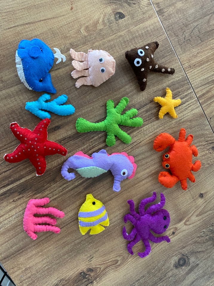 Renkli keçe deniz canlılarından oluşan yumuşak ve el yapımı oyuncak seti. Balık, denizyıldızı, yengeç ve ahtapot gibi figürler içerir.