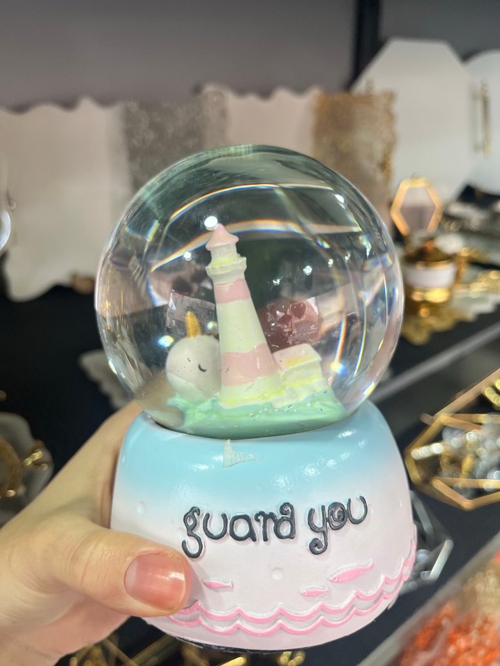 Renkli deniz feneri figürlü kar küresi, "guara you" yazılı tabana sahiptir. Canlı ve eğlenceli tasarıma sahiptir.