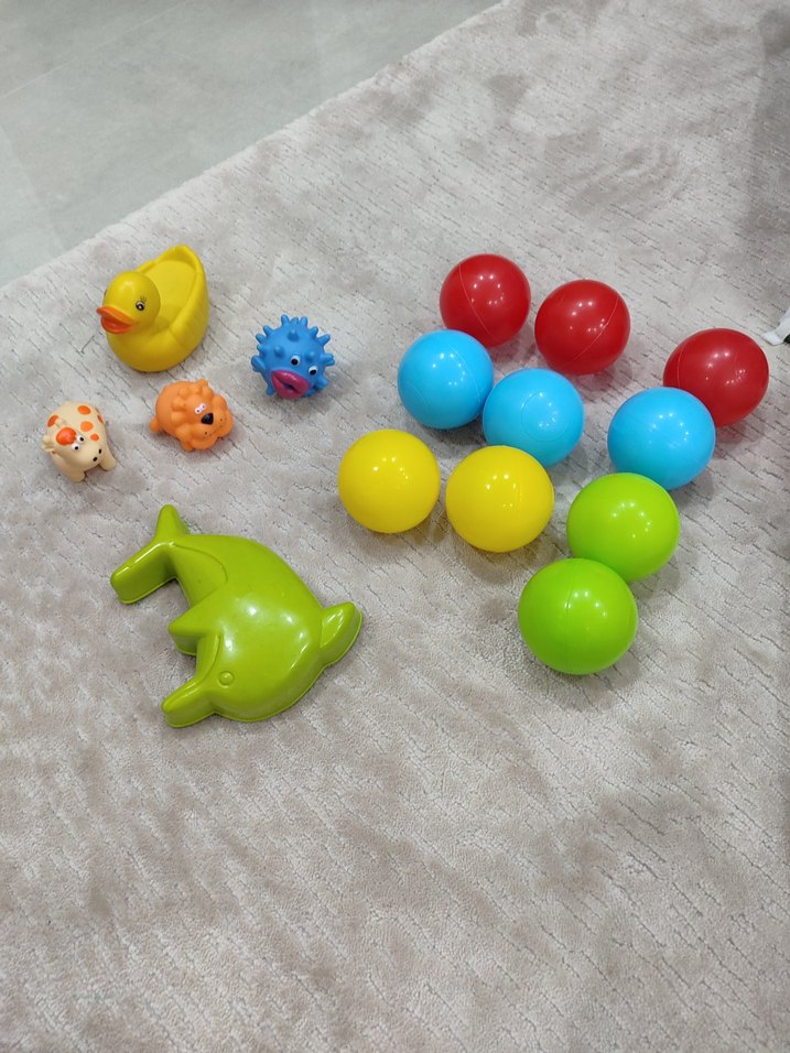 10 adet renkli top, küçük banyo oyuncakları ve balık şeklinde kum kalıbı