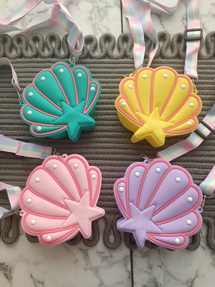 Yıldız detaylı, boncuk işlemeli renkli deniz kabuğu şeklinde kız çantaları. Ayarlanabilir pastel renkli askılar bulunur.