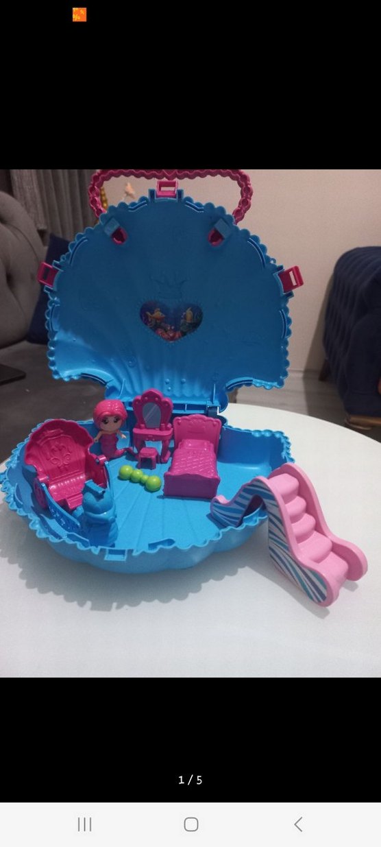Pembe ve mavi renklerde, minyatür mobilyalar ve bebek içeren deniz kabuğu şeklinde oyun seti. Yatak, sandalye, kaydırak ve aksesuarlar bulunur.