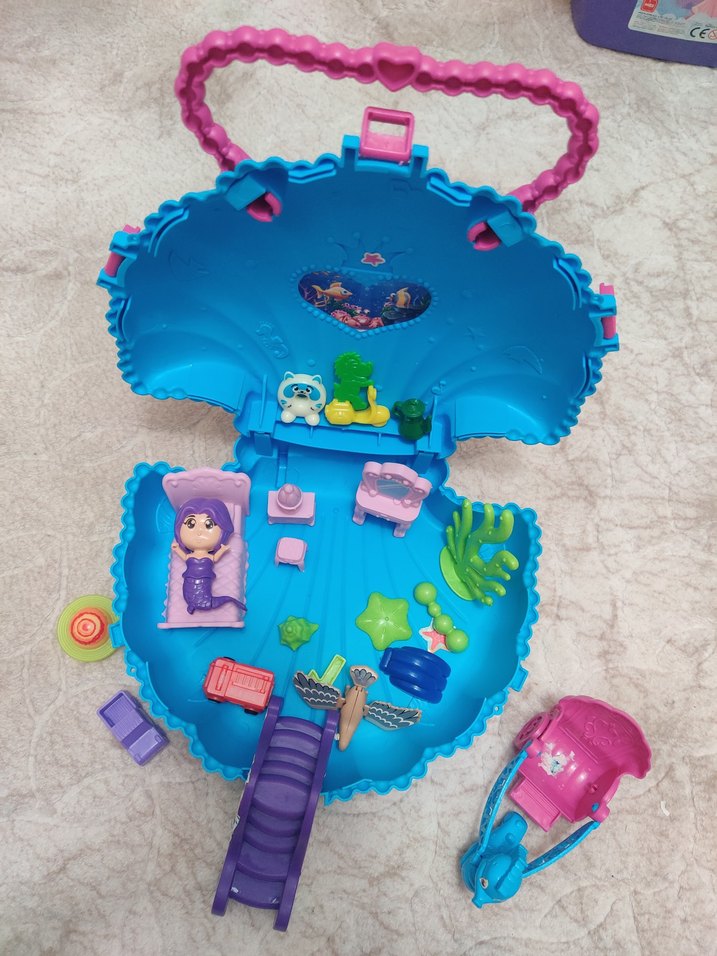 Mavi tabanlı ve pembe saplı, minyatür figürler ve aksesuarlar içeren renkli deniz kabuğu oyuncak seti. Hayal gücünü destekler. sadece kovaninn viledasinn sapi kirilmisti bantladk biz boyle kullanmistk