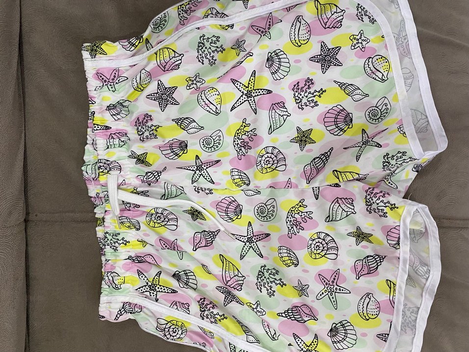 Yumuşak sentetik kumaş üzerine deniz kabukları ve denizyıldızı desenli, renkli deniz sortu.
