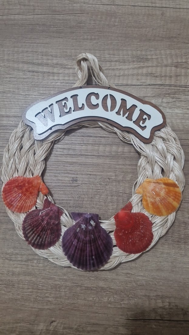 Örgülü doğal ipten yapılmış, renkli deniz kabuklarıyla süslenmiş renkli welcome kapı süsü.