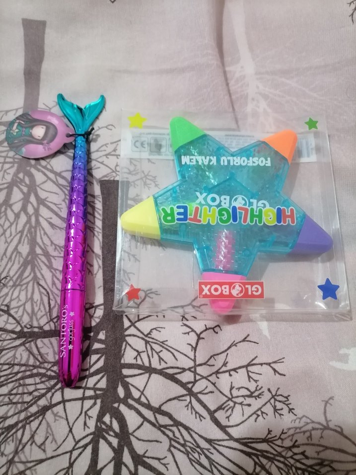 Renkli deniz kızı temalı kalem ve çok renkli yıldız fosforlu kalem seti. ✏️