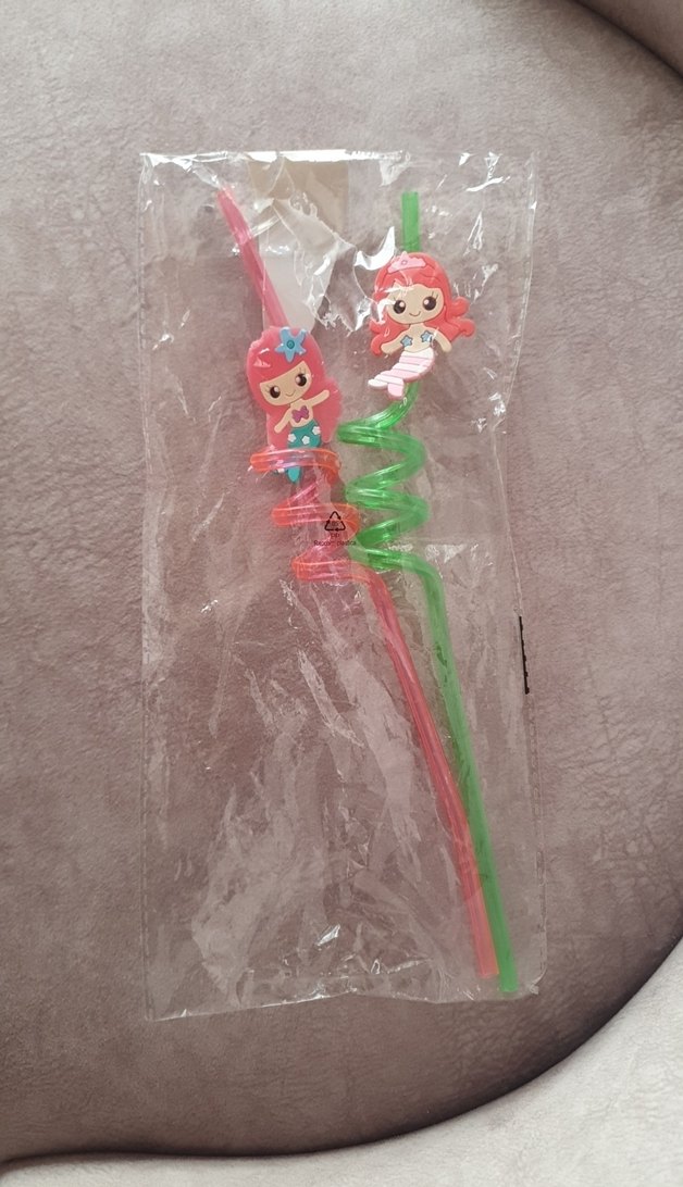 Deniz kızı figürlü, dolamalı ve düz tasarımlı renkli parti pipetleri. Canlı renkleriyle kutlamalar için uygundur. ♀️