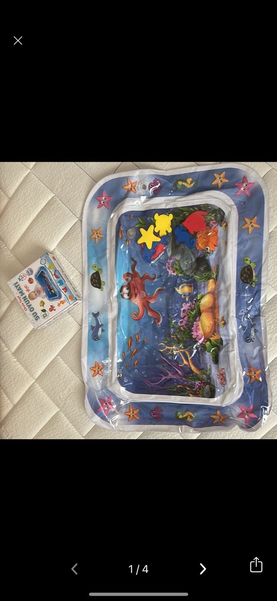 Deniz temalı, çeşitli deniz canlıları ve yüzen şekiller içeren renkli plastik bebek oyun matı.