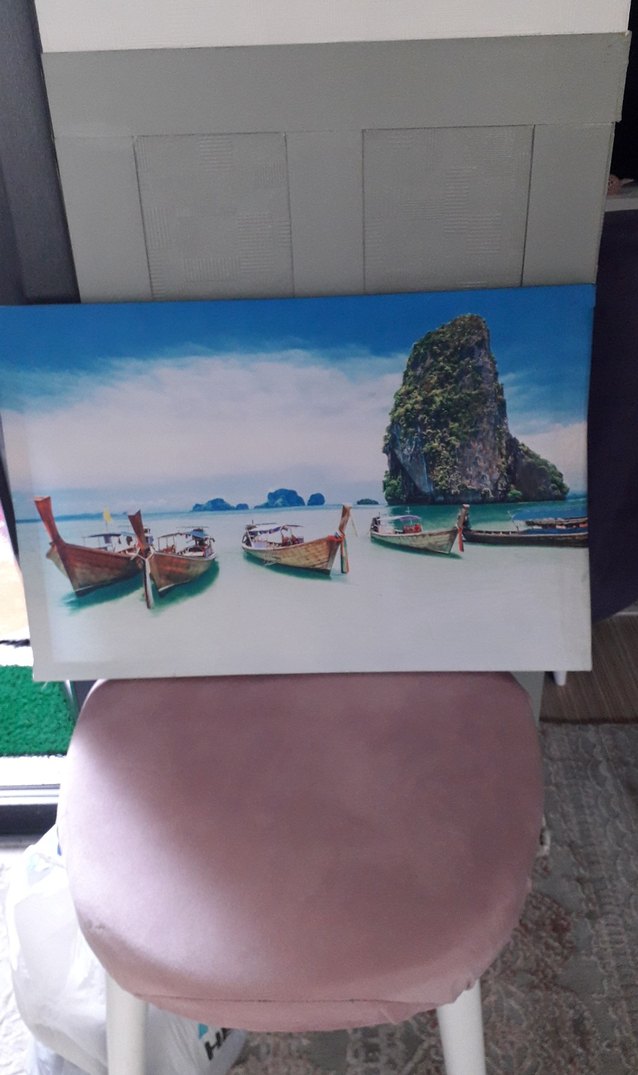 Renkli tekneler ve büyük kayalık ada ile sakin deniz manzarası sunan tablo. 65x43 toblo
