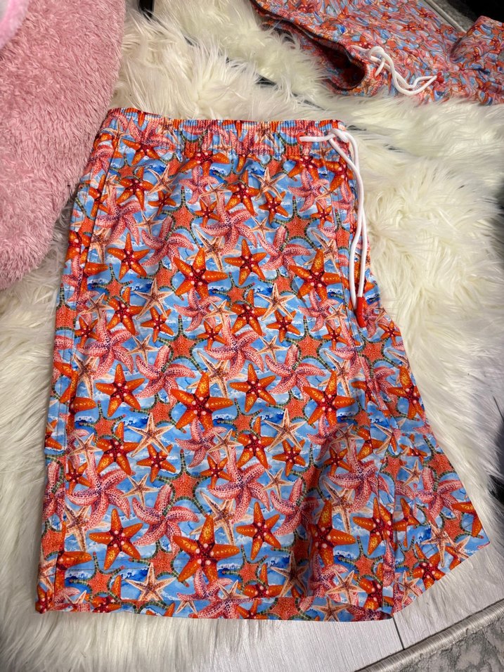 Renkli deniz yıldızı desenli, bol kesim erkek şort, fırfır detaylı, plajda ve bohem tarzda kullanıma uygun.