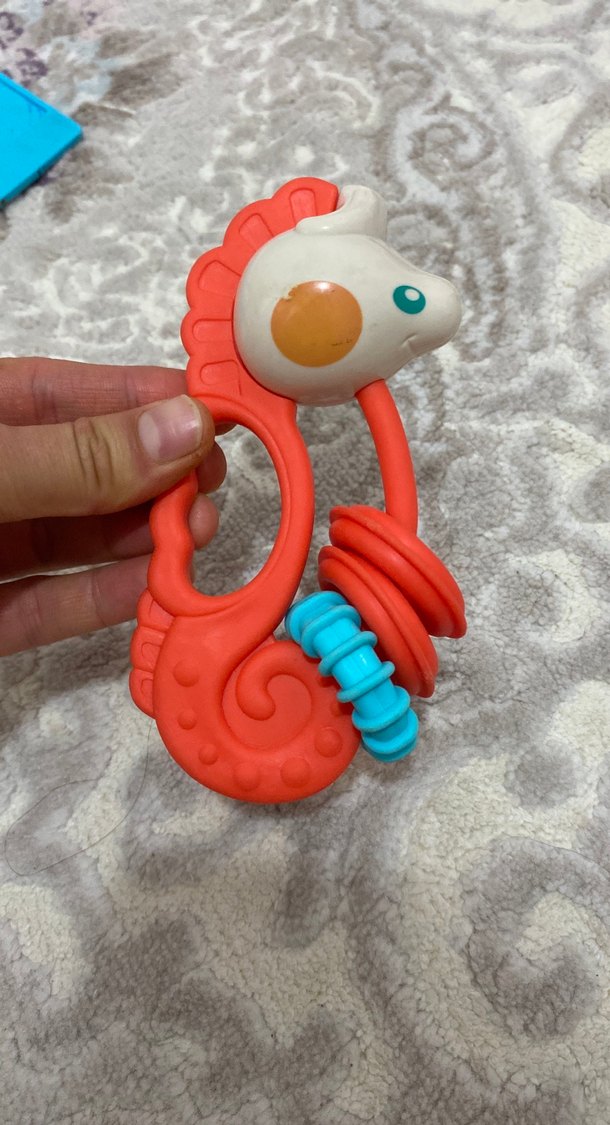 Renkli denizatı şeklinde diş kaşıyıcı ve çıngırak, yumuşak dokular ve kolay tutuş sağlar, bebeklerin diş etlerini rahatlatır ve eğlendirir.
