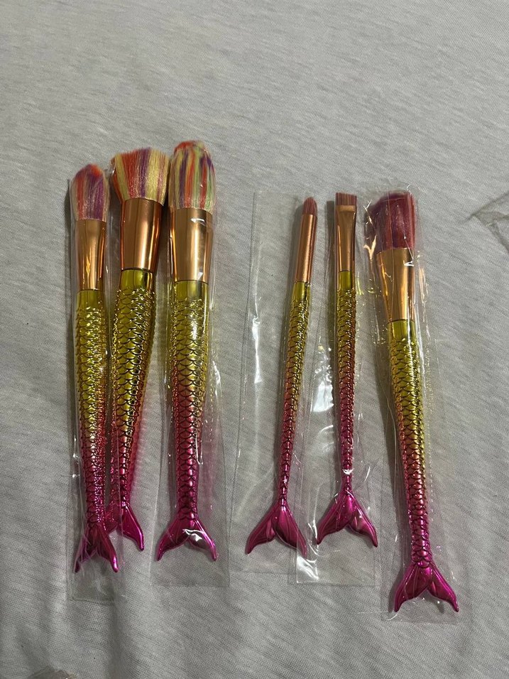Çeşitli fırça uçlarına sahip, renkli denizkızı kuyruğu saplı makyaj fırçaları seti. ️