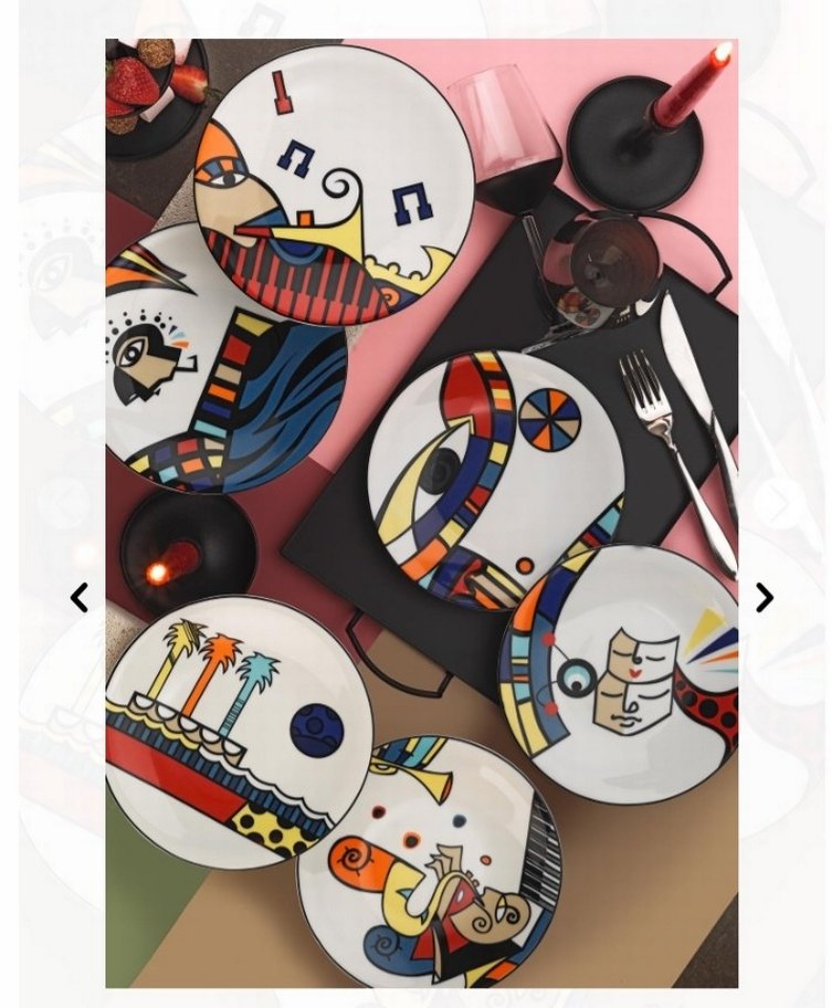 Altı adet renkli, sanatsal ve soyut desenlere sahip tabak seti. Sofranıza yaratıcı bir dokunuş katmak için ideal. ️