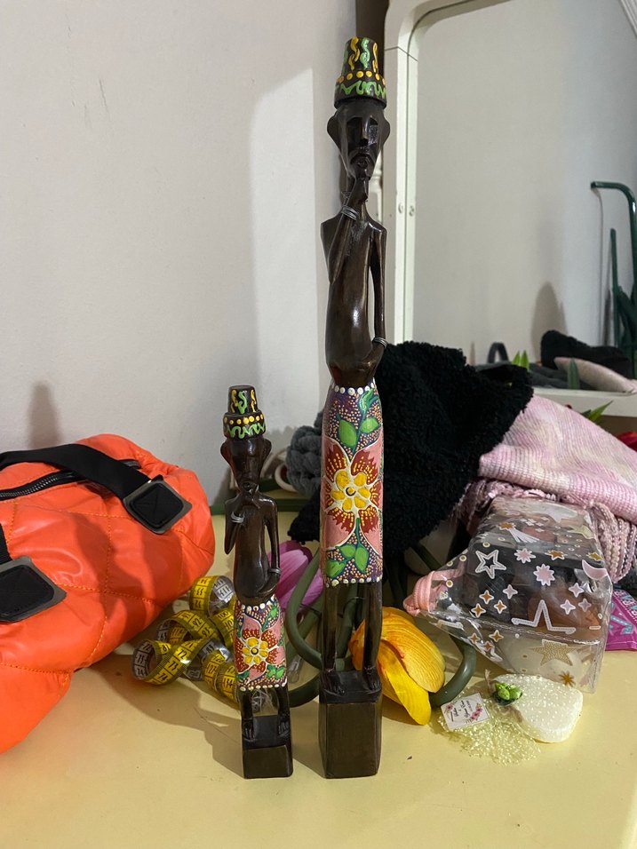 İki koyu renkli ahşap figür, alt kısımlarında ve şapkalarında renkli çiçek desenleri bulunuyor. Her biri uzun ve ince yapıda, detaylı yüz ifadelerine sahip.