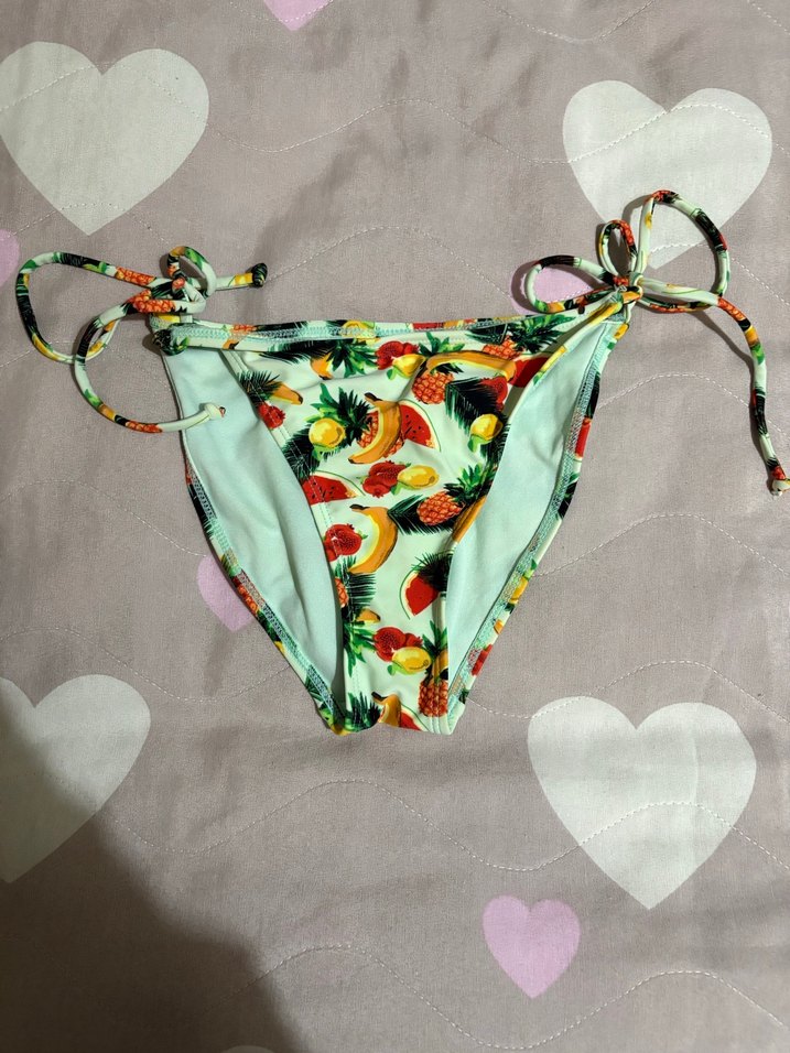 Renkli meyve desenleri ve yan bağcıkları olan düğmeli, vücuda oturan bikini altı. Cesur bohem tarzıyla plaj için uygun. Xs ve s bedene uygundur . Herhangi bir defosu yok temiz kullanıldı 2 kere bile kullanmamışımdır