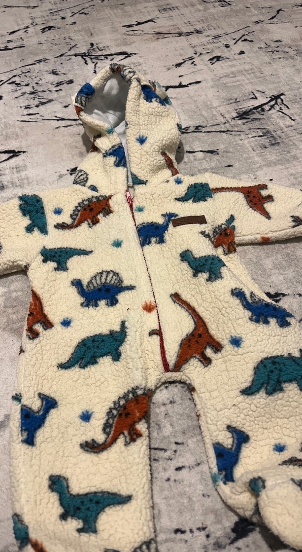 Renkli dinozor desenli, yumuşak ve sıcak kumaştan yapılmış, kürk detaylı bebek erkek tulumu.