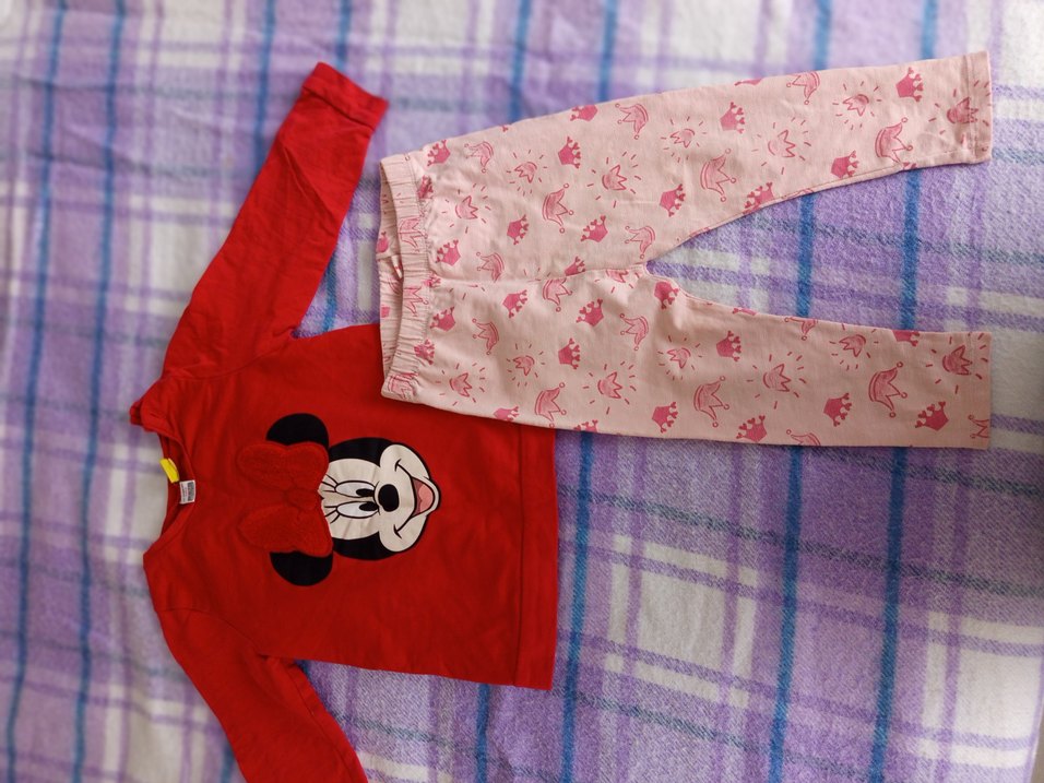 Uzun kollu, düğmeli üst ve taç desenli pembe pantolonlu renkli bebek kız takımı.