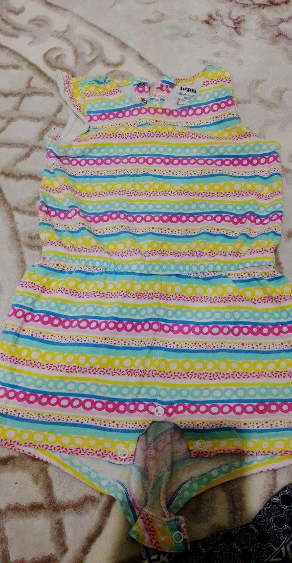 Renkli tie-dye desenli, dantel detaylı bebek kız tulumu. Canlı ve neşeli bir görünüm sunar.